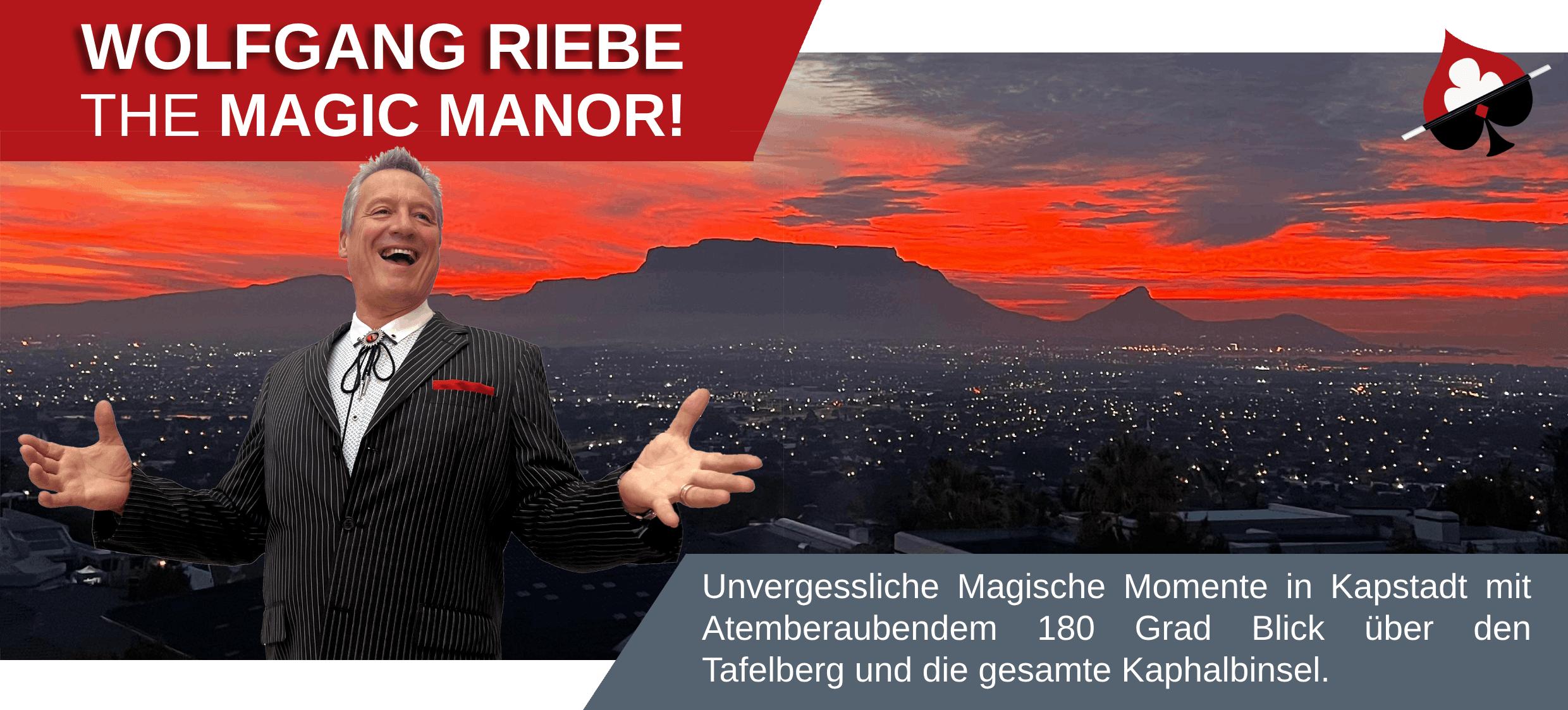 Sie haben bereits viele exklusive Erlebnisse genossen, Südafrika und Kapstadt erkundet. Wir ermöglichen Ihnen den Besuch einer privaten Villa mit spektakulärem Blick auf den Tafelberg. Lassen Sie sich von Ihrem Gastgeber, dem international bekannten Magier/Mentalist Wolfgang Riebe, verzaubern. Close Up Magic, die sie zum Staunen bringt, dazu südafrikanische Weine und Spezialitäten, ein faszinierender Sonnenuntergang (den allerdings ohne Garantie) runden diesen einzigartigen Abend ab.