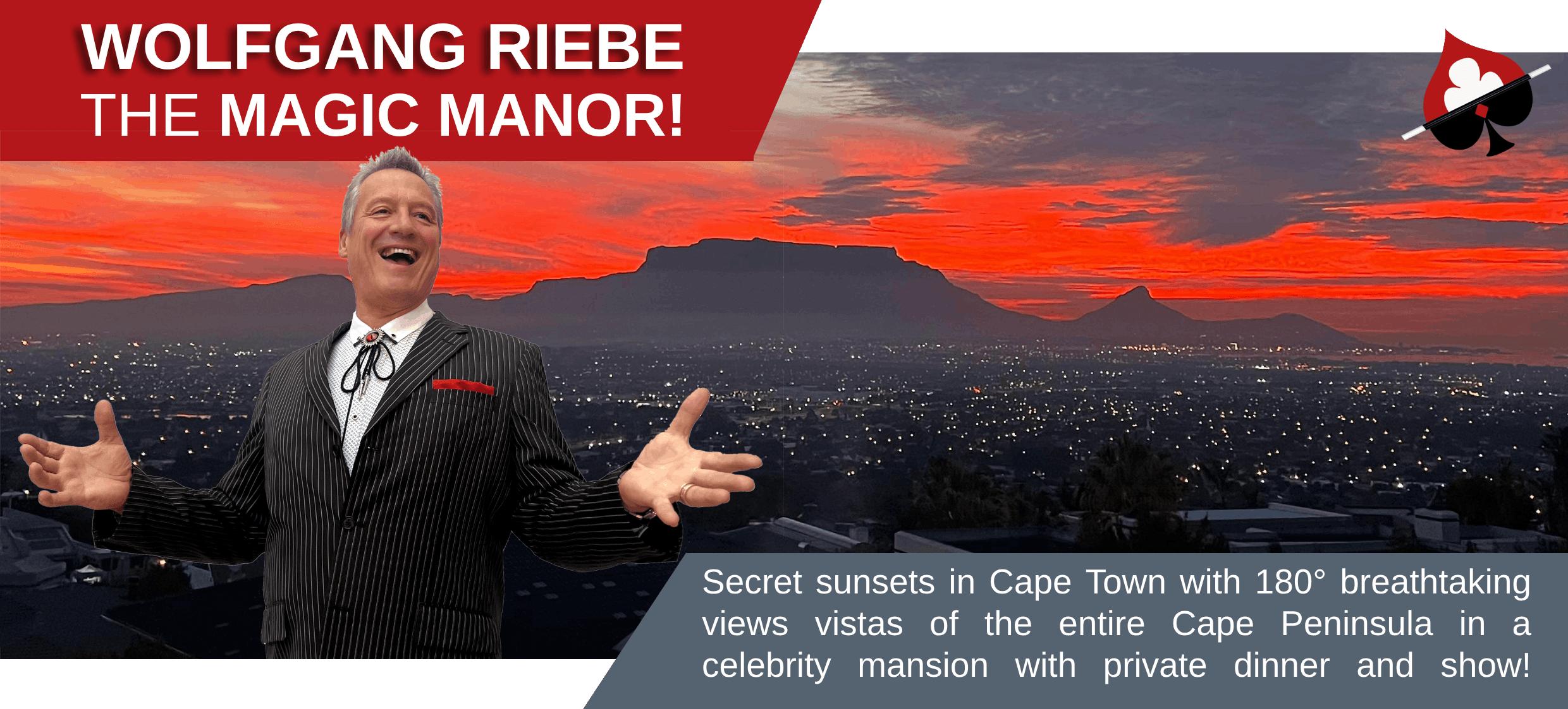 While exploring South Africa and Cape Town, embark on an enchanting journey into a magical realm with an exclusive spit barbecue, magnificent sunset (weather allowing) and show experience! Nestled within a private celebrity mansion of your host, the internationally renowned magician/mentalist Wolfgang Riebe, you will enjoy spectacular views of Table Mountain while being blown away by close up magic in a private theatre. South African delicacies and drinks round off this ‘once-in-a-lifetime’ experiential evening.